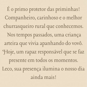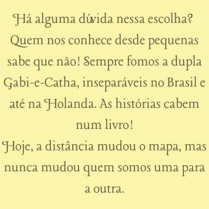 Zeven jaar later, in 1995, werd Gabriela geboren in Vitória. Ze is de dochter van Jomar en Weliana en komt uit een hecht gezin. Ze heeft een prachtige zus, Rafaela. Als kind verhuisde ze naar het platteland, een plek die haar waarden vormde en waar ze een meer dan gelukkige jeugd beleefde. Op haar 22e vertrok ze naar het buitenland, zonder iemand te kennen, zonder bed of matras. In Nederland leerde ze, groeide ze op, werd verliefd en bleef ze. Tegenwoordig werkt ze in projectmanagement en bedrijfsstrategie. Haar collega's omschrijven haar als aardig, scherpzinnig en nieuwsgierig.