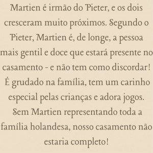 Nascido em 1988, em Utrecht, Pieter é filho de Adriaan e Mienke. Vem de família grande - é o 5° filho de 7, tendo 10 sobrinhos. Sempre muito inteligente, foi uma criança ativa e, diz ele, rebelde. Hoje, trabalha na liderança de um time de desenvolvedores de aplicativos. É sempre ocupado e requisitado - faz curso de marketing, português (uhul!), crossfit, e serve assiduamente na igreja, no grupo das crianças. Seus amigos o descrevem como amigável, criativo e sagaz!